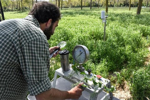 | Un technicien de l'INRA mesure le taux d'humidité d'un plant de pois au Centre d'agroforesterie de Restinclières, le 16 mai près de Montpellier. |