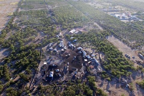 | Vue aérienne de la zone de secours des dix mineurs piégés dans une mine de charbon inondée, le 11 août à Agujita, au Mexique. |