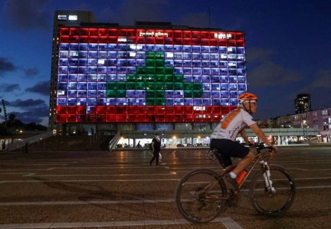 | La mairie de Tel Aviv, en Israël, aux couleurs du drapeau libanais, le 5 août. |