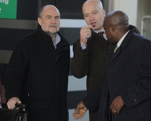 | L’inspecteur en chef de l’AIEA, Herman Nackerts (gauche), à son arrivée à Vienne, au retour d'une visite de trois jours en Iran. |