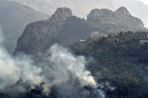 | De la fumée s'échappe d'un feu de forêt dans la région d'Ait Daoud, dans le Nord de l'Algérie, le 13 août. |