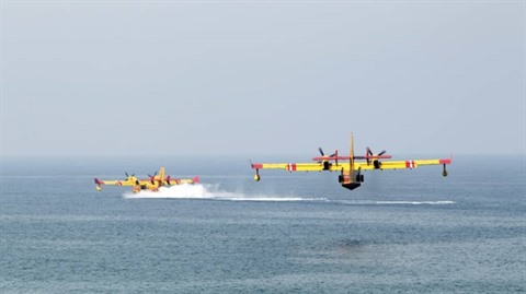 | Des bombardiers d'eau, mis à disposition par la France pour lutter contre les incendies de forêts, remplissent leurs réservoirs au large de Bejaia, le 13 août en Algérie. |