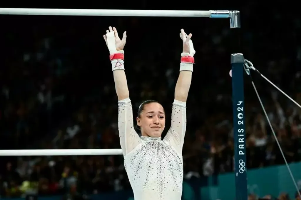 | L'Algérienne Kaylia Nemour lors de la finale des barres asymétriques aux JO-2024, à Paris le 4 août. |