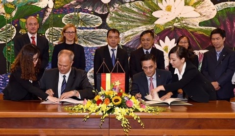 | Le vice-ministre vietnamien des Finances, Trân Xuân Hà (à droite), et l’ambassadeur allemand, Christian Berger, signent l’accord de coopération financière. |