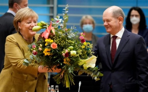 | La chancelière allemande Angela Merkel reçoit un bouquet de fleurs d'Olaf Scholz (droite), candidat du parti social-démocrate à la chancellerie, le 24 novembre à Berlin. |