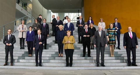 | La chancelière allemande Angela Merkel (centre) entourée par les membres de son gouvernement, le 24 novembre à Berlin. |