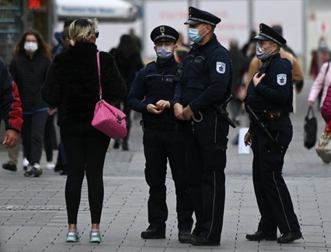 | Des policiers vérifient que les passants portent des masques de protection à Munich, le 22 octobre. |