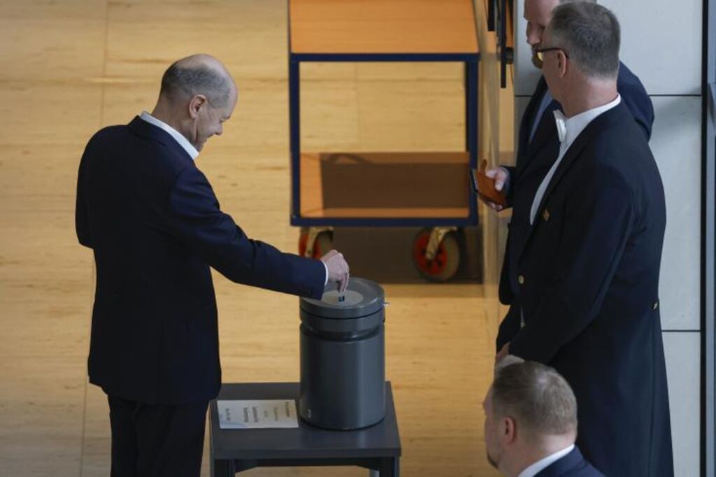 | Le chancelier allemand Olaf Scholz vote sur la légalisation du cannbis au Bundestag, le 23 février 2024 à Berlin. |