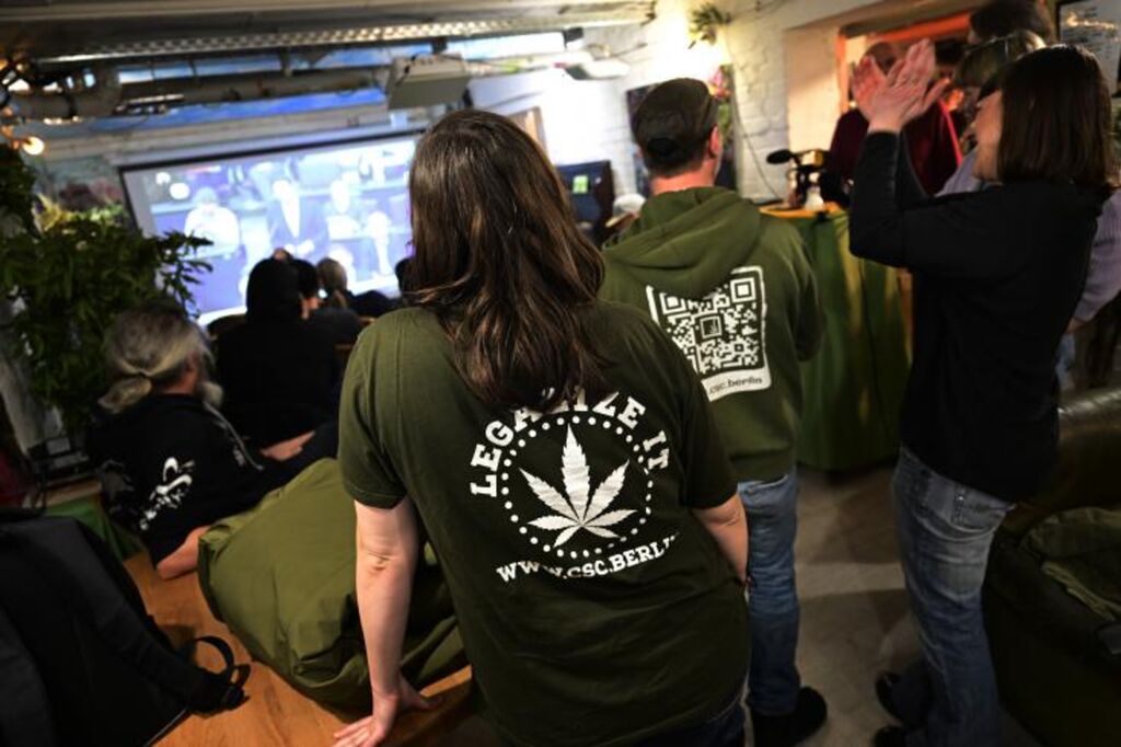 | Des membres du personnel du Musée du chanvre de Berlin suivent sur un écran le débat au Bundestag sur la légalisation du cannabis, le 23 février. |