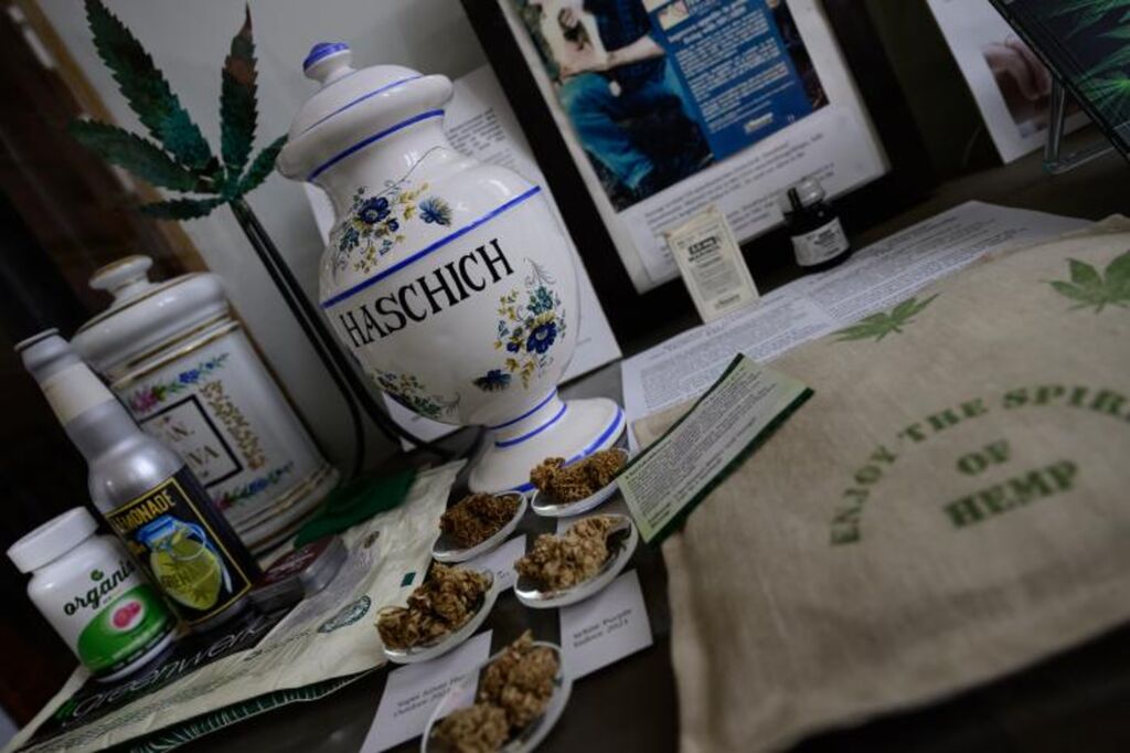 | Une exposition expliquant les usages médicaux du cannabis au Musée du chanvre de Berlin alors que le Bundestag doit voter sur la légalisation du cannabis, le 23 février. |