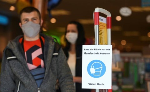| Écriteau qui indique que le port du masque est obligatoire, à l'entrée d'un magasin à Hamm (Nord-Ouest de l'Allemagne), le 27 avril. |