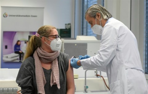 | Un membre du personnel hospitalier reçoit une injection du vaccin de Moderna contre le COVID-19, à l'hôpital universitaire d'Essen (Allemagne), le 18 janvier. |