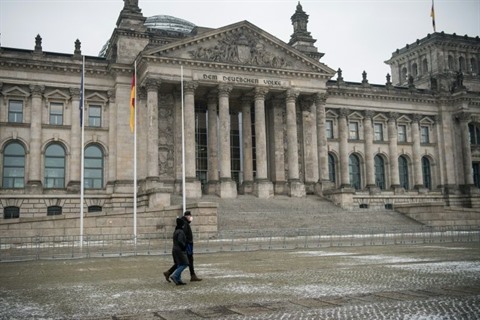 | Des passants portent des masques de protection devant le bâtiment du Reichstag, abritant l'Assemblée parlementaire allemande, à Berlin (Allemagne), le 18 janvier. |