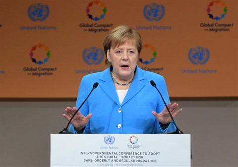 | La chancelière allemande Angela Merkel s'exprime à la conférence de l'ONU sur les migrations à Marrakech, au Maroc, le 10 décembre. |