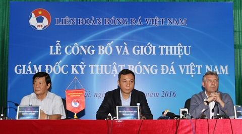 | Cérémonie de présentation du directeur technique de football du Vietnam, Jürgen Gede (droite), le 20 juin à Hanoi. |