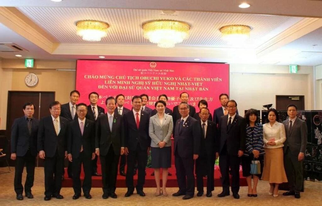 | Des représentants de l’ambassade du Vietnam au Japon et une délégation de l’Alliance parlementaire d’amitié Japon - Vietnam posent pour une photo de groupe. |