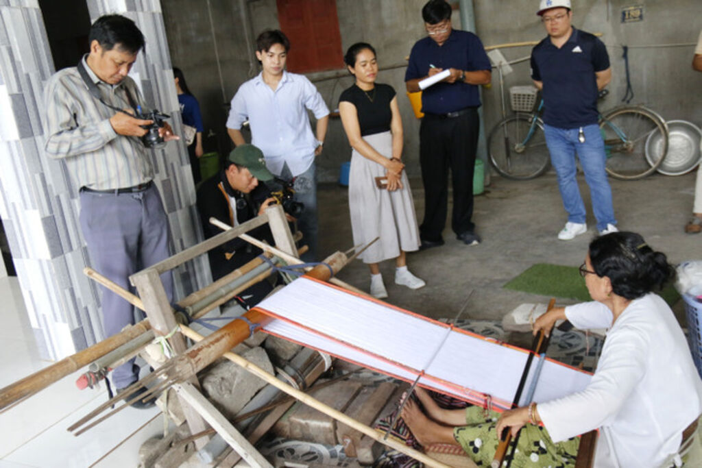 | Une démonstration de tissage de brocatelle traditionnelle par la communauté Cham, invitant les visiteurs à vivre une expérience culturelle à la fois vivante et authentique. |