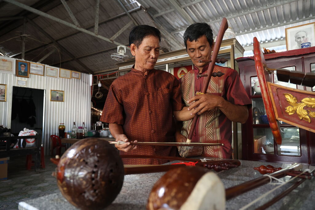| Lâm Phen (gauche) guide un Khmer à jouer l'intrument musical traditionel. |
