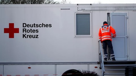 | Un employé de la Croix-Rouge allemande ferme une station mobile de dépistage du COVID-19 à Heinsberg, en Allemagne. |