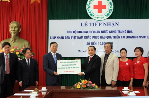 | L'ambassade de Chine au Vietnam a remis le 14 septembre à Hanoi 10.000 dollars au Comité central de la Croix-Rouge du Vietnam au profit des sinistrés des pluies diluviennes et crues dans le Centre. Photo : Nguyên Thuy/VNA/CVN |