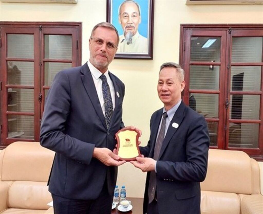 | Le secrétaire général du Comité olympique du Vietnam, Trân Van Manh, accueille l'ambassadeur de France au Vietnam, Olivier Brochet. |