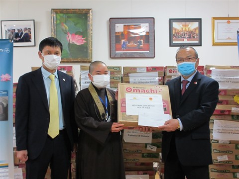 | L'ambassadeur Vu Hông Nam (droite) remet 100 boîtes de nouilles instantanées à l'Association des bouddhistes vietnamiens au Japon le 22 avril. |