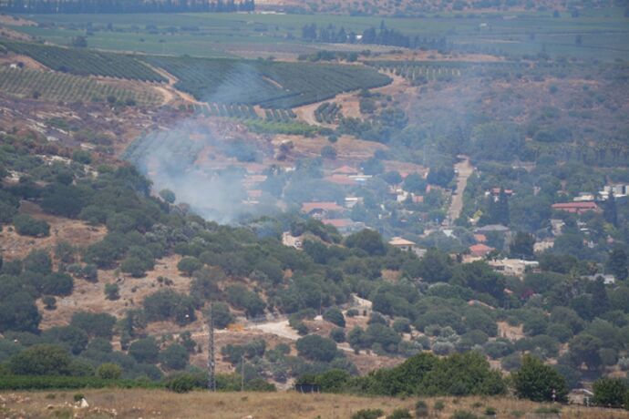 | De la fumée s'élève à la suite d'une frappe israélienne à Tayr Harfa, au Sud du Liban, le 12 juillet. |