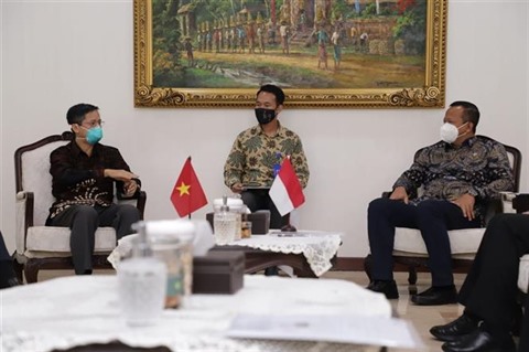 | L’ambassadeur du Vietnam en Indonésie, Pham Vinh Quang (gauche), a eu une séance de travail le 16 octobre avec le ministre indonésien des Affaires maritimes et de la Pêche, Edhy Prabowo. |
