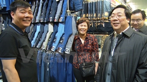 | L'ambassadeur Nguyên Thanh Son (droite) visite la boutique d'un couple vietnamien du Centre commercial de Moscou. |