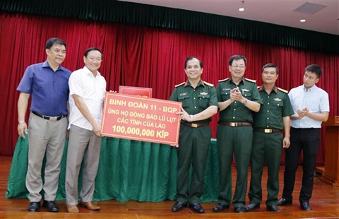 | Des représentants du 11e corps de troupes du ministère de la Défense du Vietnam remettent un don de 100 millions de kips. |