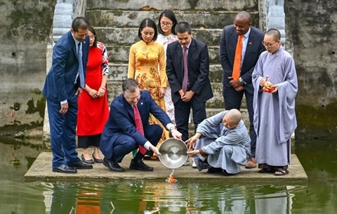 | L'ambassadeur américain au Vietnam, Daniel J.Kritenbrink, relâche des carpes dans un lac pour faire ses adieux aux Génies du Foyer. |