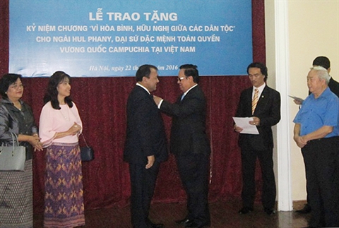 | Le président de l'Union des organisations d'amitié du Vietnam, Vu Xuân Hông (droite), remet l'insigne à l'ambassadeur cambodgien Hul Phany, le 22 juillet. |