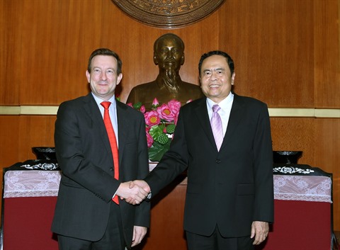 | Le président du Comité central du Front de la Patrie du Vietnam Trân Thanh Mân (droite) et l'ambassadeur de France au Vietnam, Bertrand Lortholary. |
