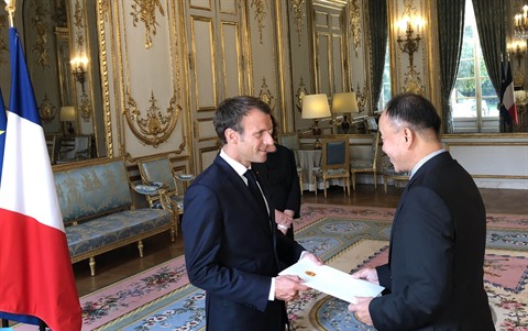 | L’ambassadeur vietnamien Nguyên Thiêp (droite) et le président français Emmanuel Macron, le 31 août à Paris. |
