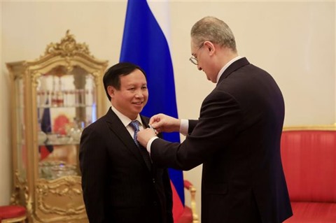 | Le vice-ministre russe des Affaires étrangères, Igor Morgulov, remet l'Ordre de l'Amitié de la Russie à l'ambassadeur du Vietnam en Russie, Ngô Duc Manh. |