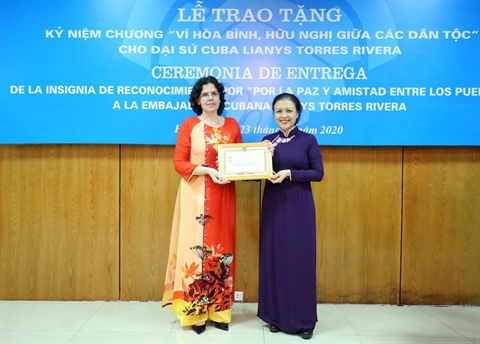 | L’ambassadrice Nguyên Phuong Nga (droite) décerne l’insigne "Pour la paix et l’amitié entre les peuples" à l’ambassadrice cubaine sortante au Vietnam Lianys Torres Rivera. |