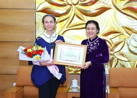 | L'ambassadrice Nguyên Phuong Nga (droite) remet l'insigne "Pour la paix, l’amitié entre les peuples" à Sara Valdes Bolano |
