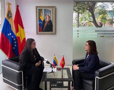 | L'ambassadrice vénézuélienne Tatiana Josefina Pugh Moreno (gauche) répond à une correspondante de l'Agence Vietnamienne d'Information |