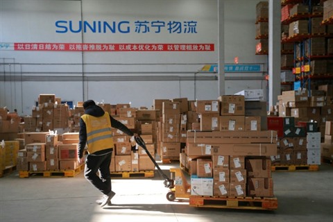 | Un employé transfère des colis à livrer à l’entrepôt de Suning Logistics Network, à Shenyang en Chine, le 11 novembre 2020. |