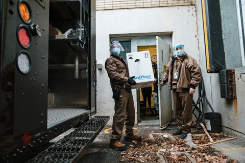 | Un employé d'UPS porte une boîte contenant des vaccins contre le COVID-19 à Montréal, le 14 décembre. |