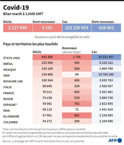 L'Europe au sens large, qui avait franchi la barre de 600.000 morts il y a un mois, reste la zone la plus touchée en termes de décès avec 747.887 morts tandis que 601.256 habitants du sous-continent latino-américain ont péri du COVID-19, selon un comptage réalisé par l'AFP mardi 2 février à 22h00 GMT à partir de bilans fournis par les autorités de santé. Suivent les États-Unis/Canada (464.204) et l'Asie (241.391).