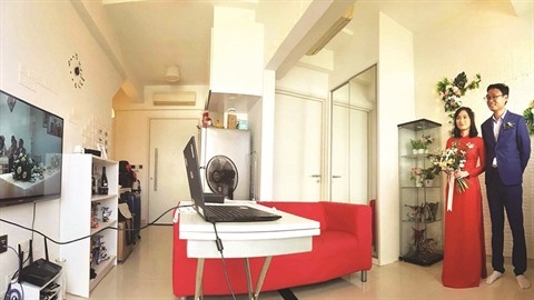 Les préparatifs des futurs conjoints à Singapour ont été plus simples. Vân a acheté des fleurs pour décorer le salon. Une télévision était connectée à Internet. Sa copine a pris en charge l’ao dài et le maquillage Dans ce moment important, le futur époux pensait même qu’ils étaient chez eux au Vietnam et a agi en respectant les coutumes, à distance. Il s’est tenu devant la porte, alors que ses parents, au Vietnam, entraient dans la maison de son épouse. En même temps, il les suivait aussi dans sa maison à Singapour. Puis, il a amené la future mariée au salon.