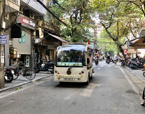 | Une voiture électrique transportant des touristes à la découverte du Vieux quartier de Hanoï, dont la rue Lan Ông. |