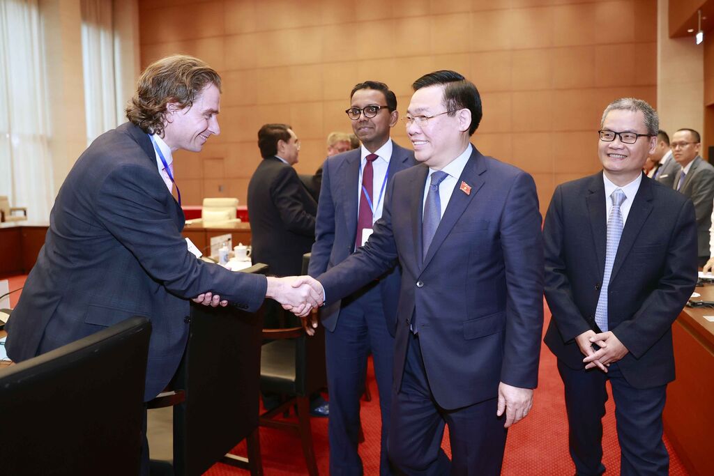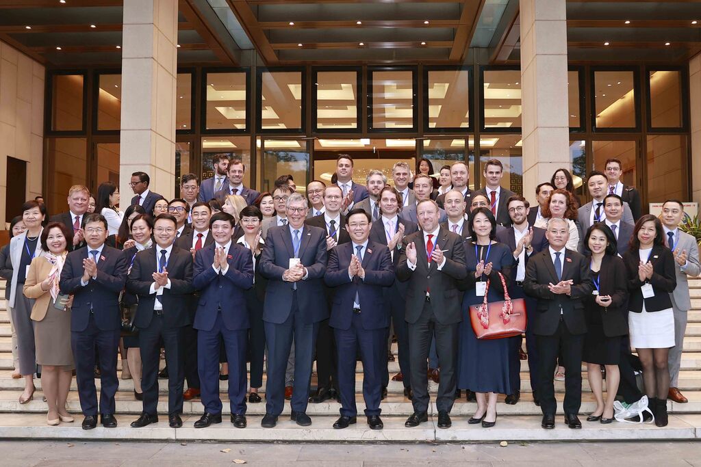 | Photo de souvenir du président de l'Assemblée nationale Vuong Dinh Huê et la délégation du Conseil des affaires UE - ASEAN et de la Chambre de commerce européenne au Vietnam (EuroCham). |