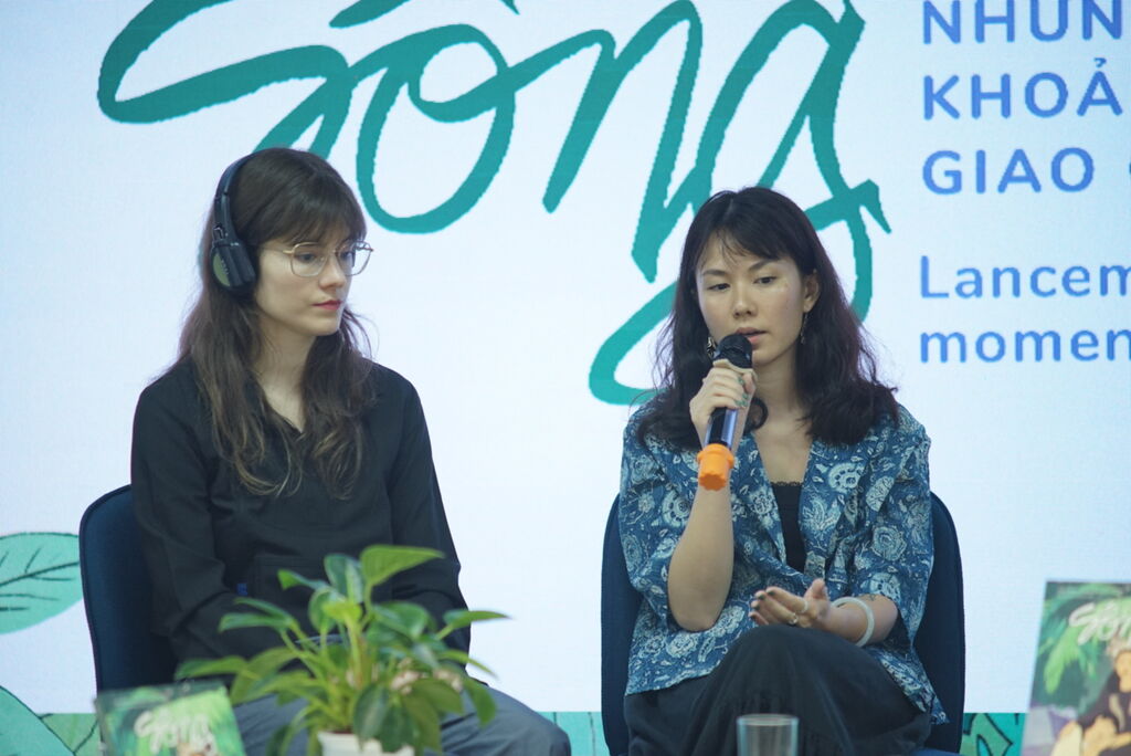 | L'auteure Trân Hai Anh (droite) et son amie, l'illustratrice Pauline Guitton lors du lancement de la version vietnamienne de leur BD Sông (En vie, en français), le 12 mars à Hanoï. |
