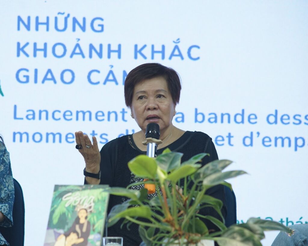 | La réalisatrice Viêt Linh, aussi le personnage principal de la BD Sông dont sa fille Hai Anh est l'auteure, a partagé ses émotions lors du lancement de cet excellent album au Vietnam. |