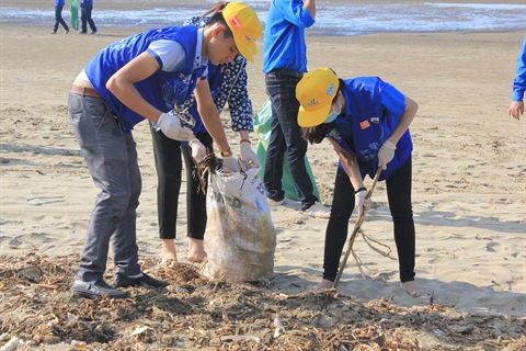 | Ramassage des ordures sur la plage de la commune de Quang Vinh, chef-lieu de Sâm Son, province de Thanh Hoa. |