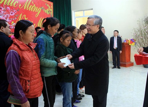 | Trân Quôc Vuong remet des cadeaux aux démunis et bénéficiaires de la politique sociale dans la commune de Kim Quan, province montagneuse de Tuyên Quang (Nord). |