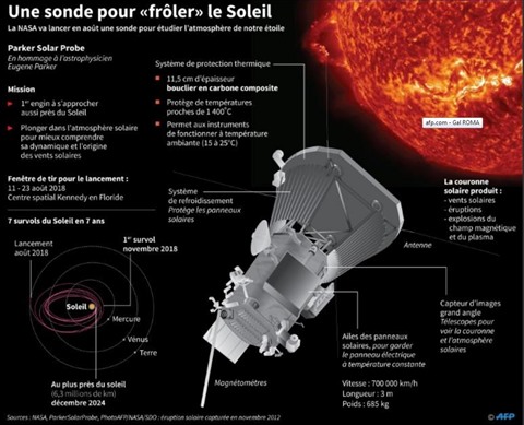 | Schéma expliquant le lancement prévu le 11 août de la sonde "Parker Solar Probe" destinée à plonger dans l'atmosphère du soleil et mieux comprendre sa dynamique et l'origine des vents solaires. |
