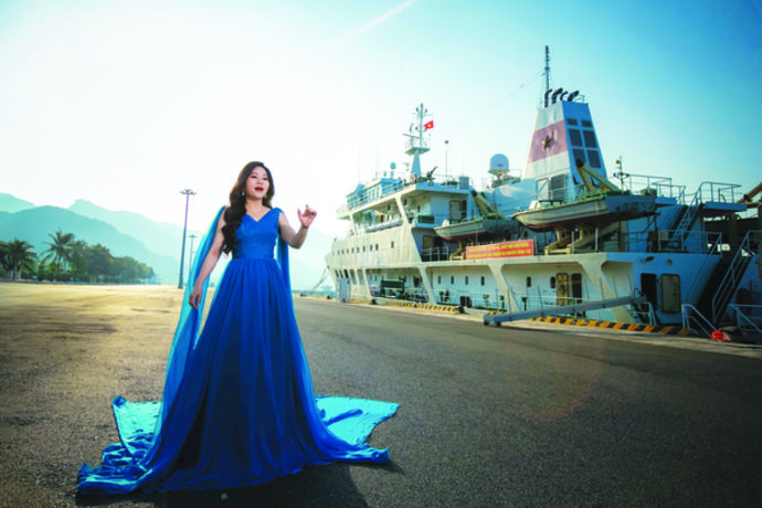 | La chanteuse Nguyên Duyên Quynh représente lors de la cérémonie du lancement du vidéo clip Nguyện thề vì bình yên. |